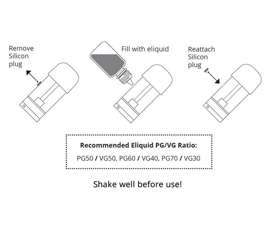 To refill your XPOD Vape POD, remove the silicon plug from the side of a blank cartridge (POD) and fill the POD with the e-liquid of your choice. Reattach the plug and let the device sit for 5-7 minutes to let the atomizer pad absorb e-liquid.